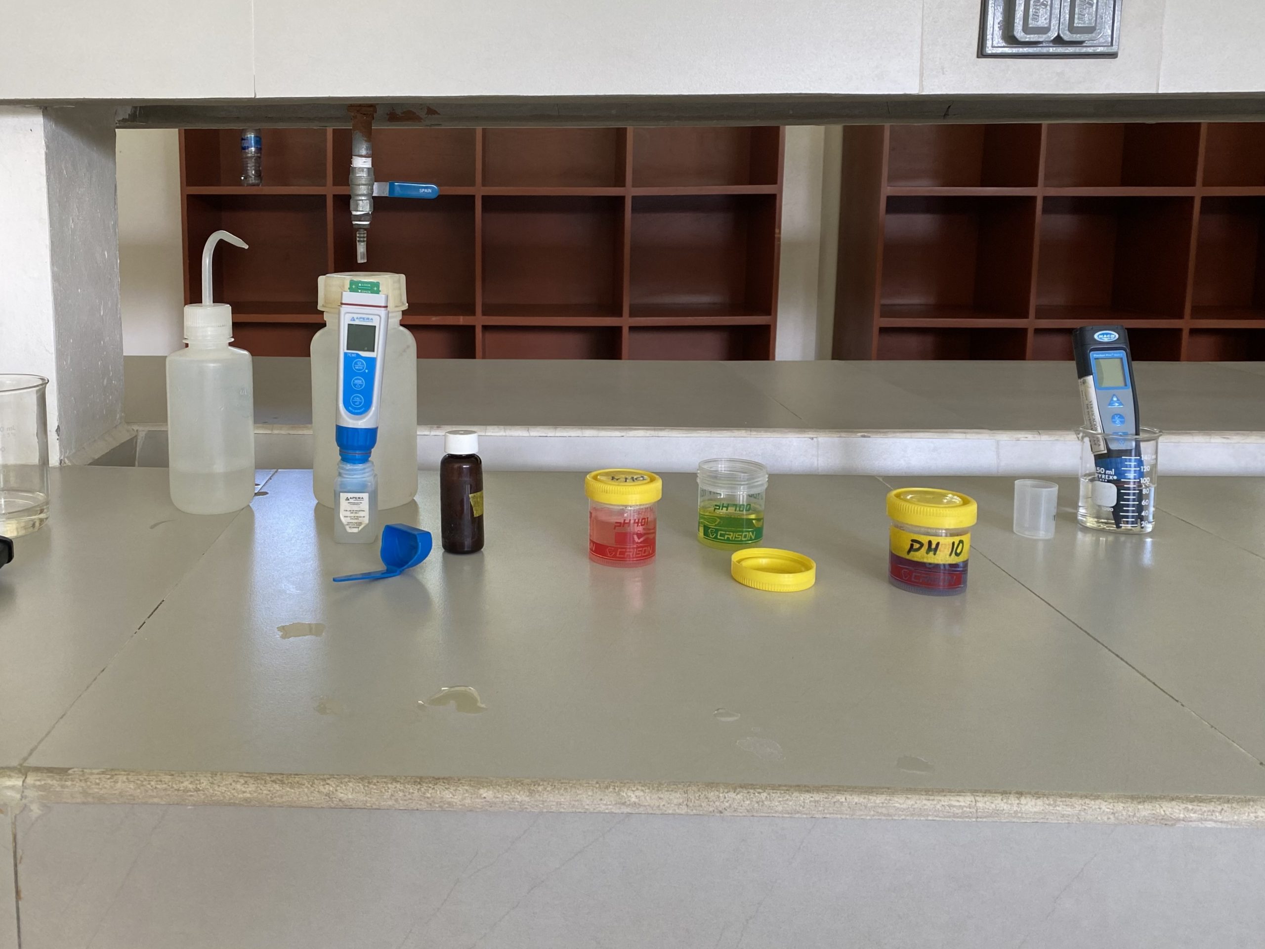 Equipos e insumos utilizados en el taller sobre el mantenimiento y calibración de equipos para medición de PH y oxímetros utilizados en la acuicultura