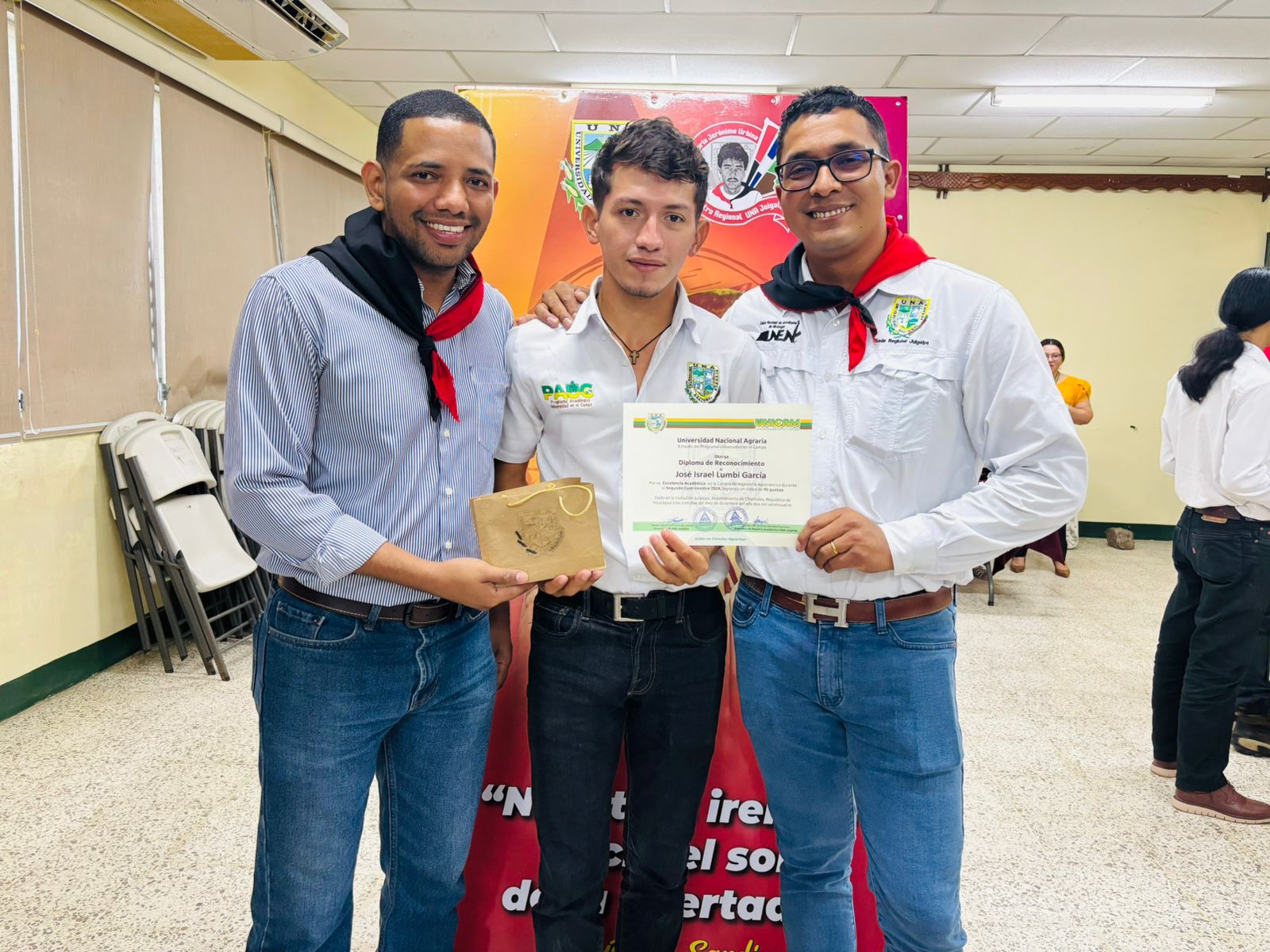 Este miércoles 04 de diciembre, en el Auditorio Pablo Úbeda del Centro Universitario Regional de Juigalpa (CUR-UNA), se llevó a cabo la entrega de certificados y obsequios a estudiantes destacados del programa Universidad en el Campo (UNICAM) de la Universidad Nacional Agraria (UNA). Los estudiantes reconocidos representaron los UNICAM de: Muelle de los Bueyes, El Rama, Morrito, El Ayote y Juigalpa.