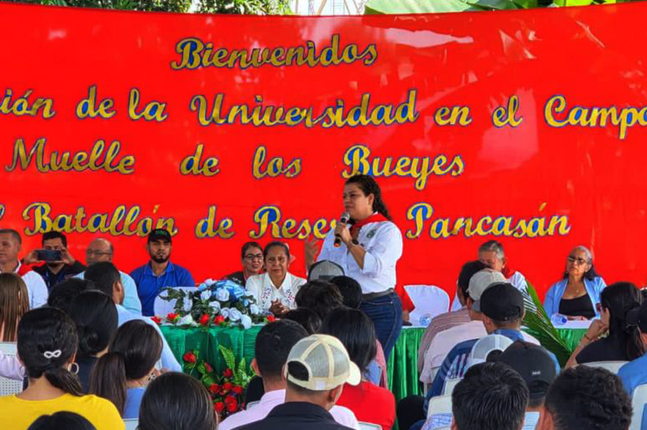 Por su parte, la compañera Teresa García, Alcaldesa de Muelle de los Bueyes en su mensaje destacó que, “la Universidad en el Campo es una alternativa educativa e innovadora que nuestro Buen Gobierno de Reconciliación y Unidad Nacional nos trae a nuestra comunidad, es un programa muy bonito, dirigido a los territorios alejados, donde van a profesionalizarse los hijos de los productores, hijos de campesinos y obreros”.