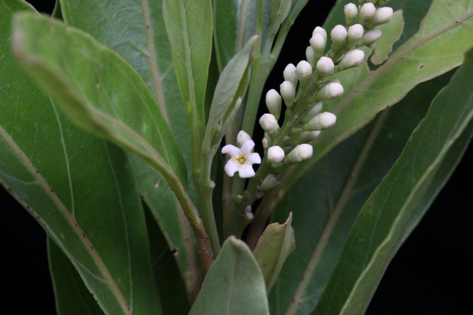 Árbol o arbusto de 5-20 m. Ramas jóvenes tetragonales (cuadradas). Hojas simples, opuestas, oblongo-obovadas (8-19 cm), glabras, lustrosas en el haz. Racimos largos (hasta 40 cm), péndulos. Flores fragantes, corola blanca. Fruto drupa, globosa (6-10 mm), roja y luego negra.